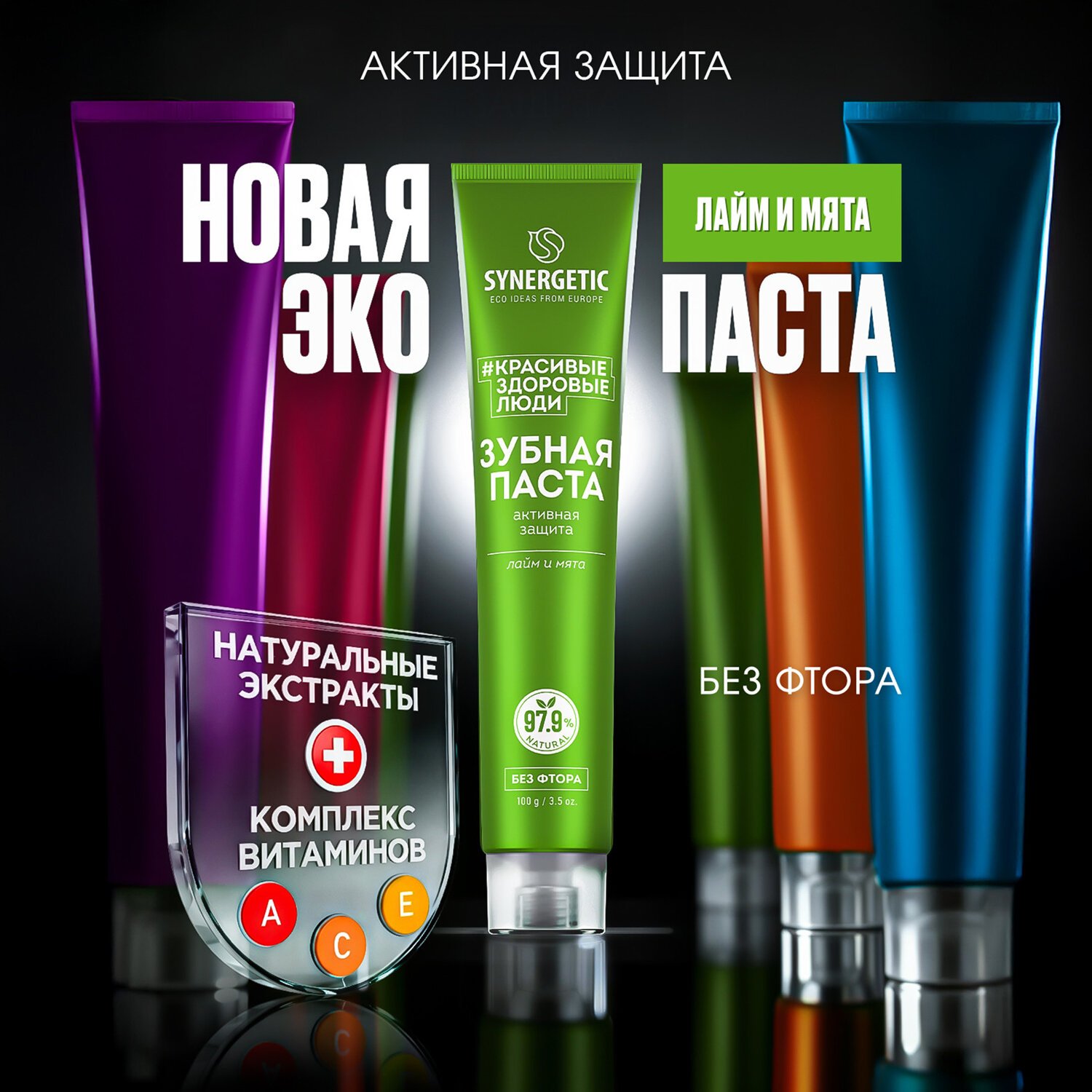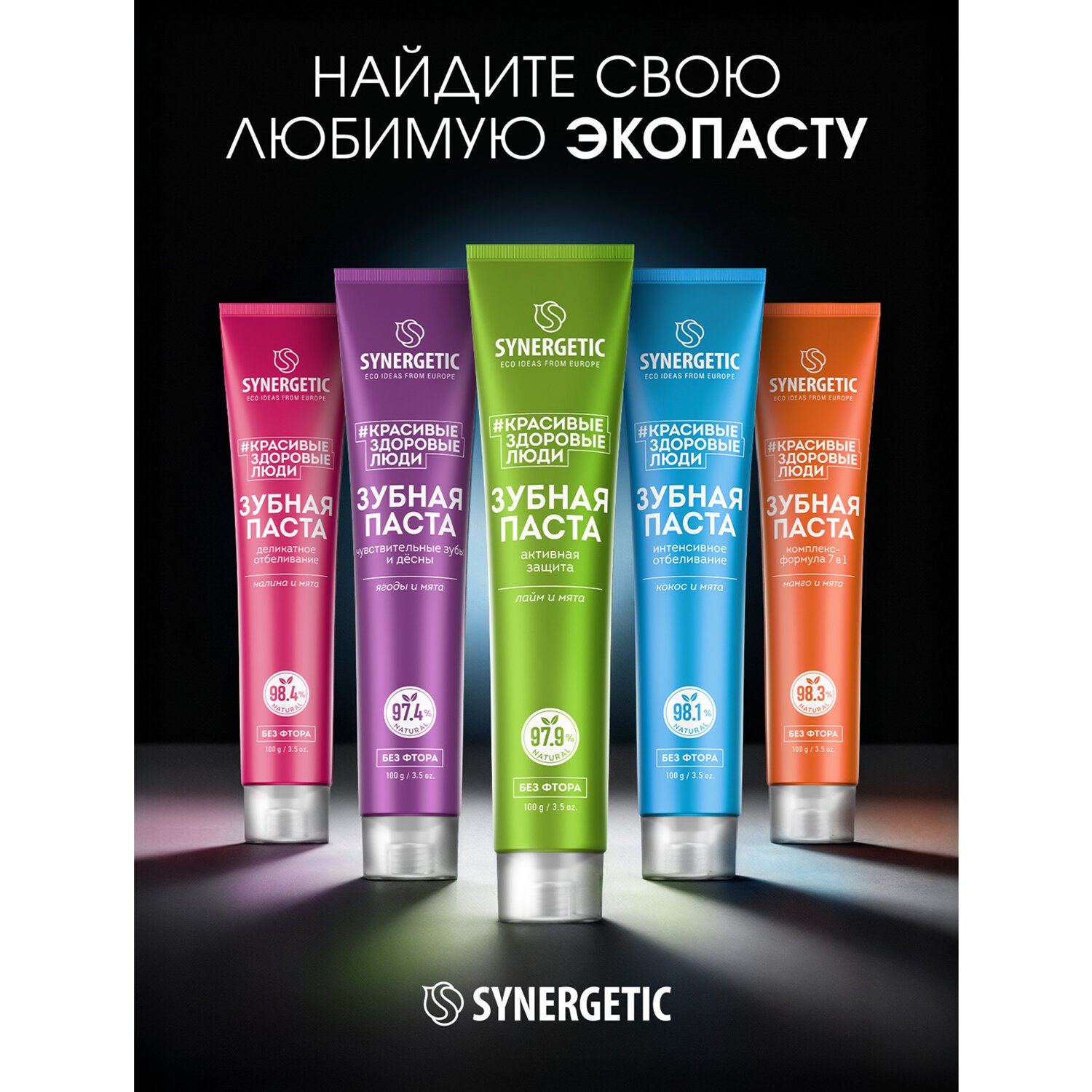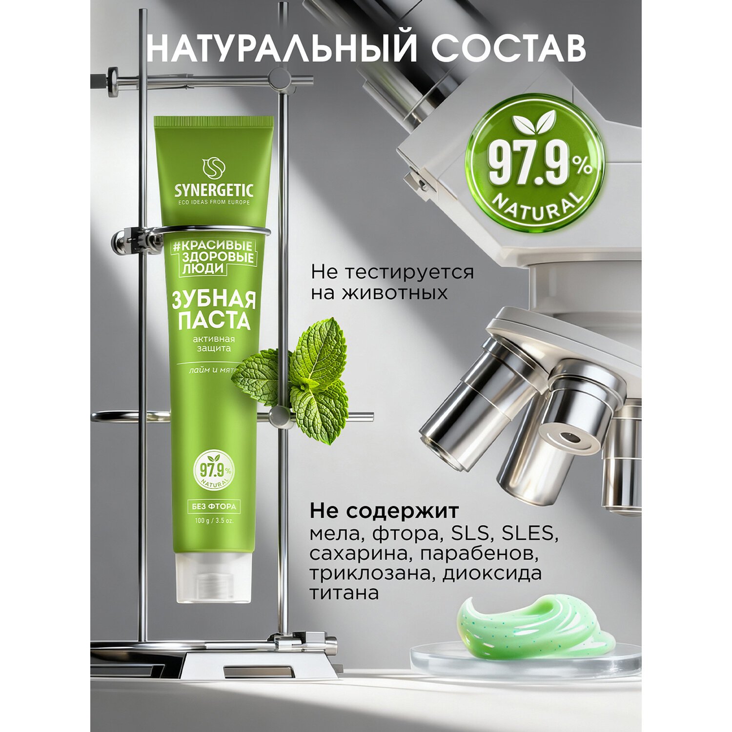Зубная паста 100 г SYNERGETIC "Активная защита", лайм и мята, без фтора, 201002