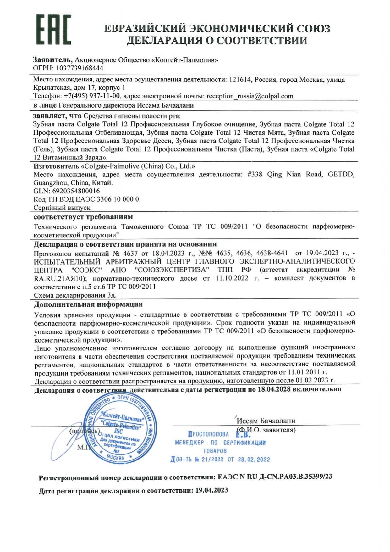 Зубная паста COLGATE "Total" - витаминный заряд с цинком и аргинином для комплексной антибактериальной защиты всей полости рта в течение 12 часов.