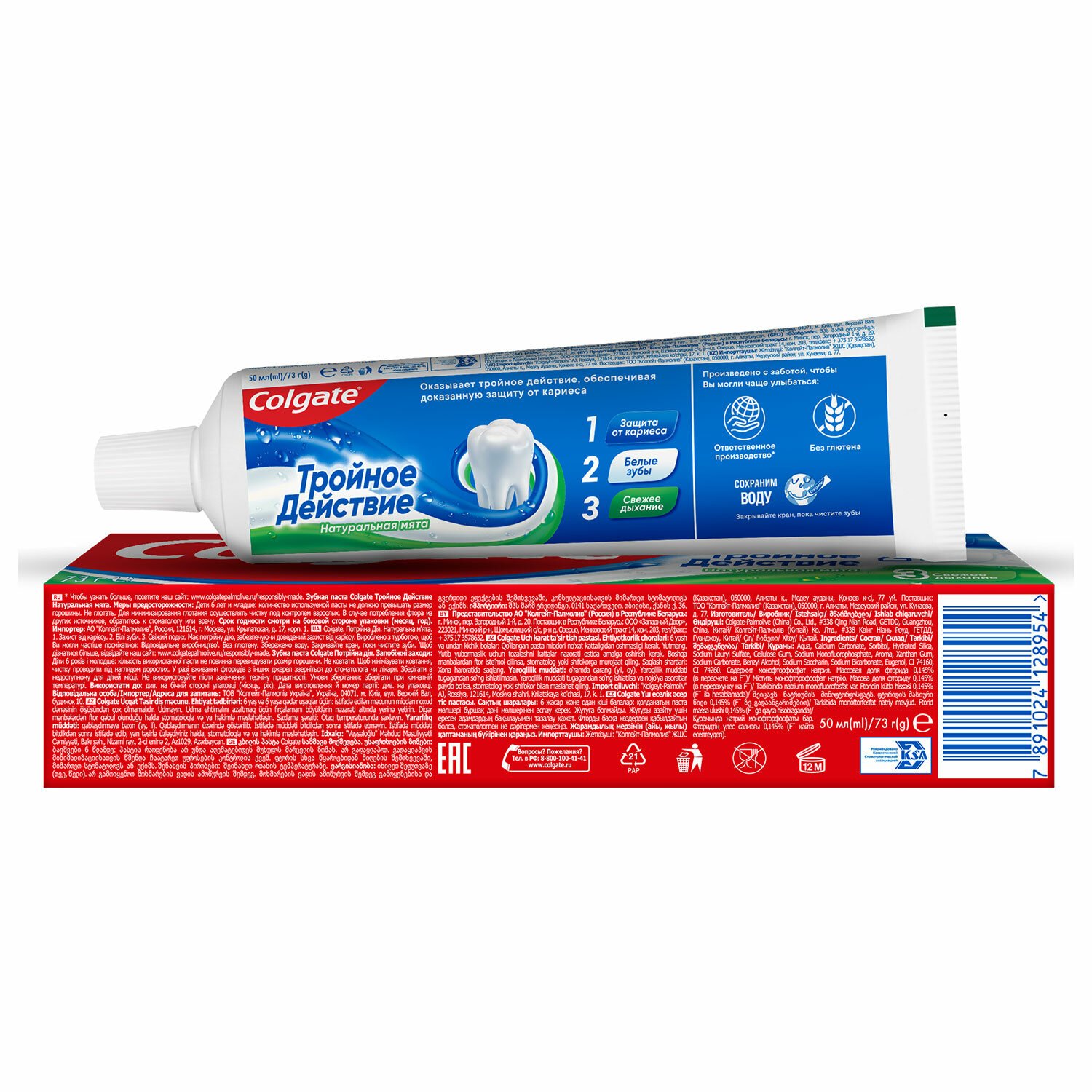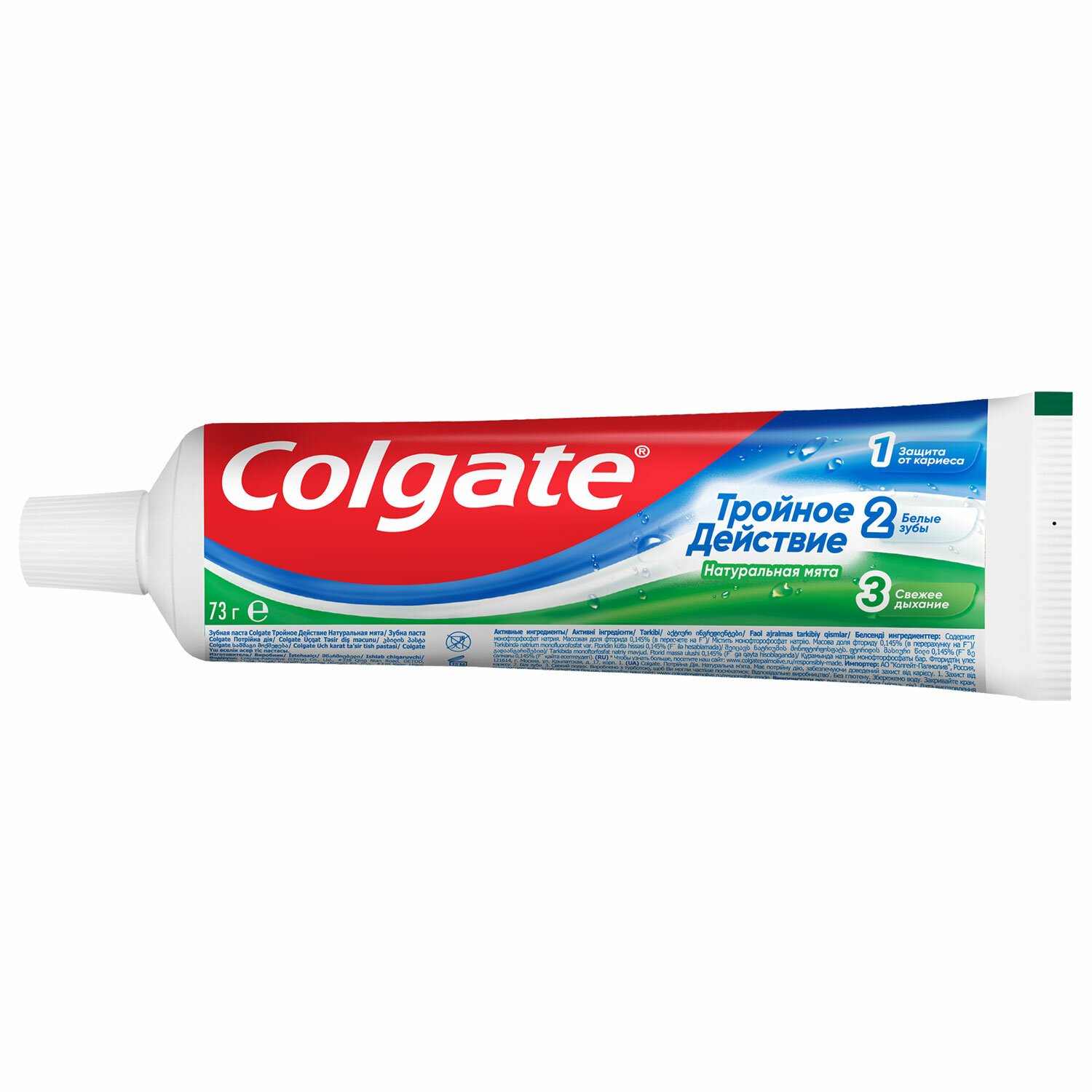 Зубная паста 50 мл COLGATE "Натуральная мята", тройное действие, с фторидом обеспечивает максимальную защиту от кариеса. Оказывает тройное действие: помогает защищать зубы от кариеса, помогает удалять потемнения с поверхности зубов и освежает дыхание.