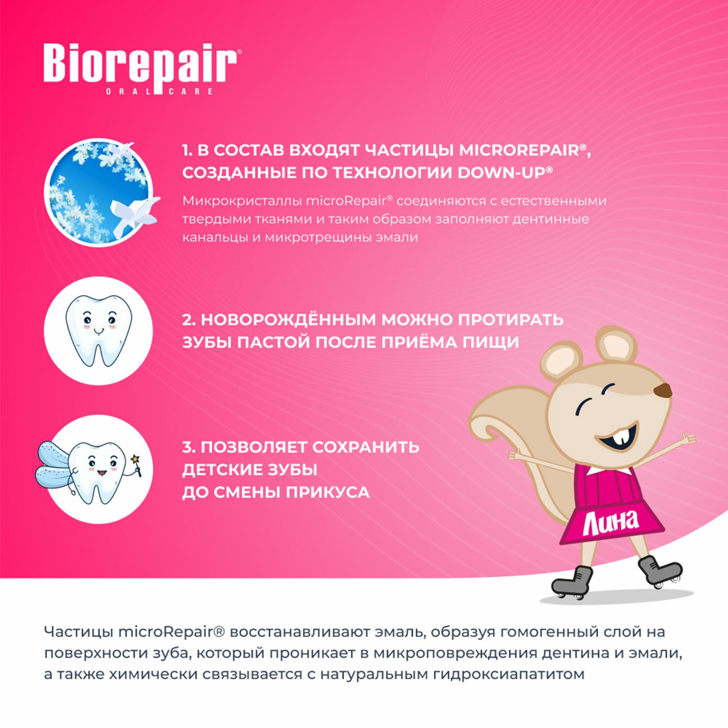 BIOREPAIR Kids – единственная зубная паста, содержащая частицы microRepair, которые укрепляют эмаль молочных зубов, способствуя правильному развитию и здоровью коренных. Её эффективность клинически протестирована. Исключительно деликатная формула BIOREPAIR Kids содержит экстракт земляники, который увлажняет и питает дёсны, облегчает процесс прорезывания зубов.