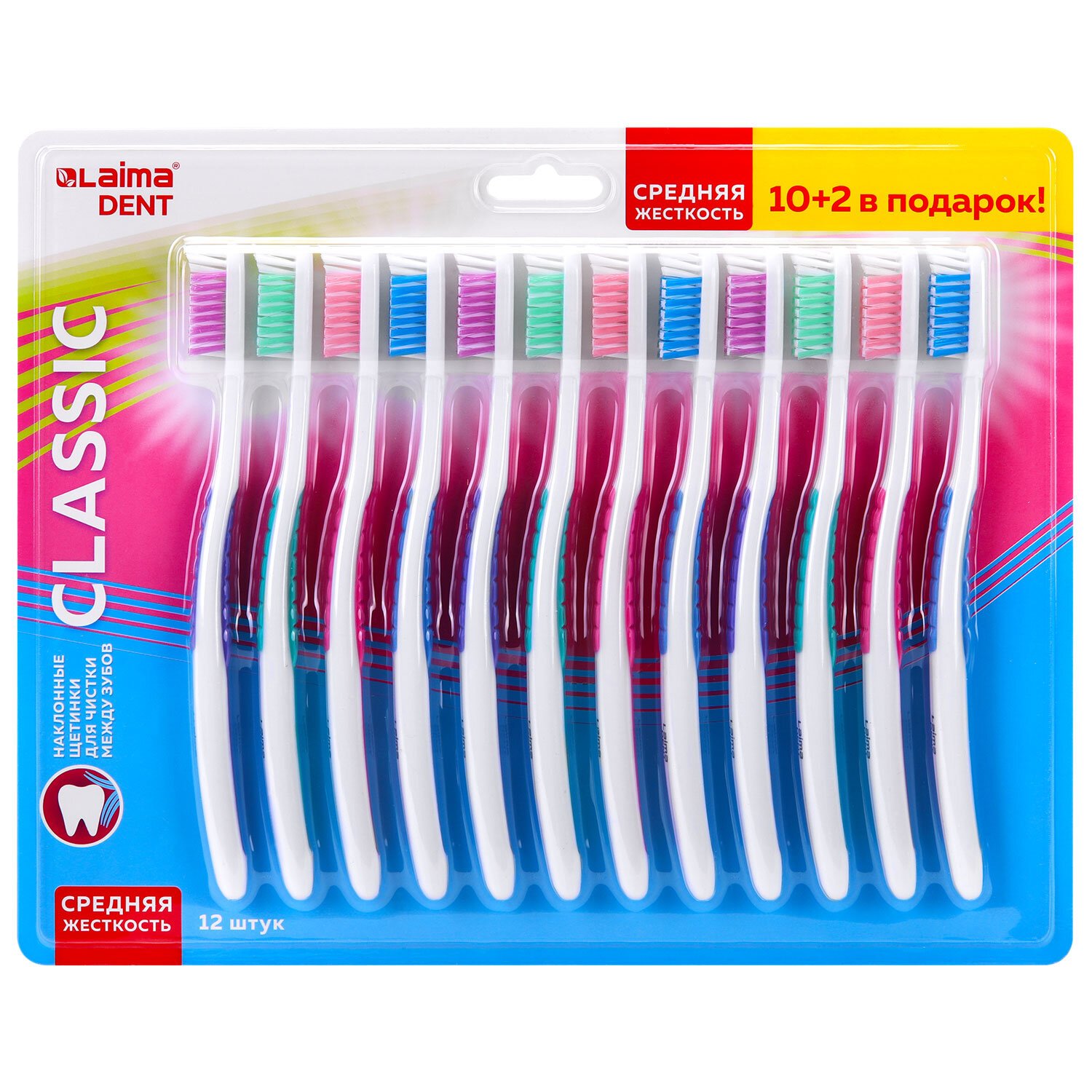 Зубная щетка средней жесткости, КОМПЛЕКТ 12шт (10+2 в подарок), LAIMA DENT, 609689