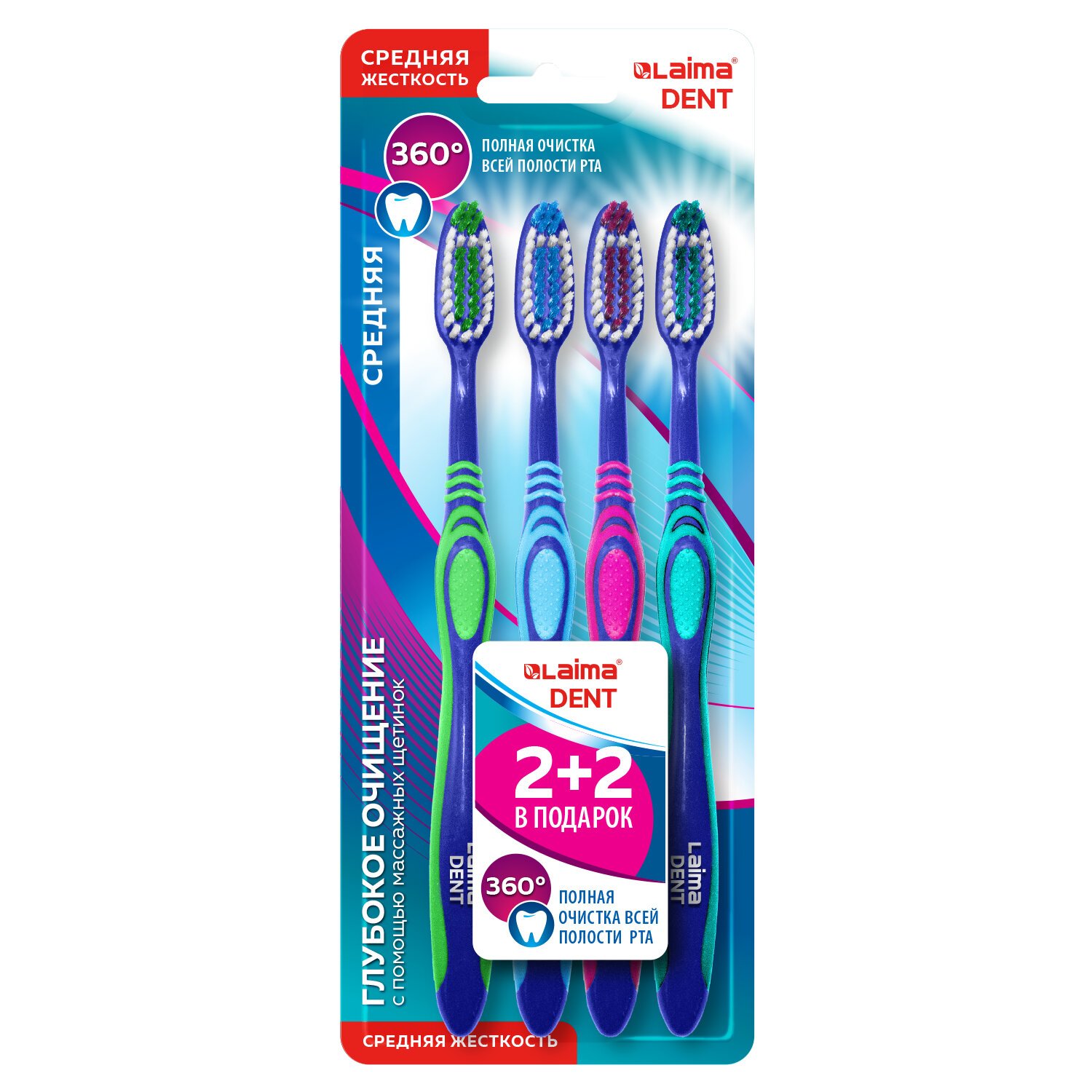 Зубная щетка средней жесткости, с чисткой языка, гибкая, КОМПЛЕКТ 4шт, LAIMA DENT, 609323