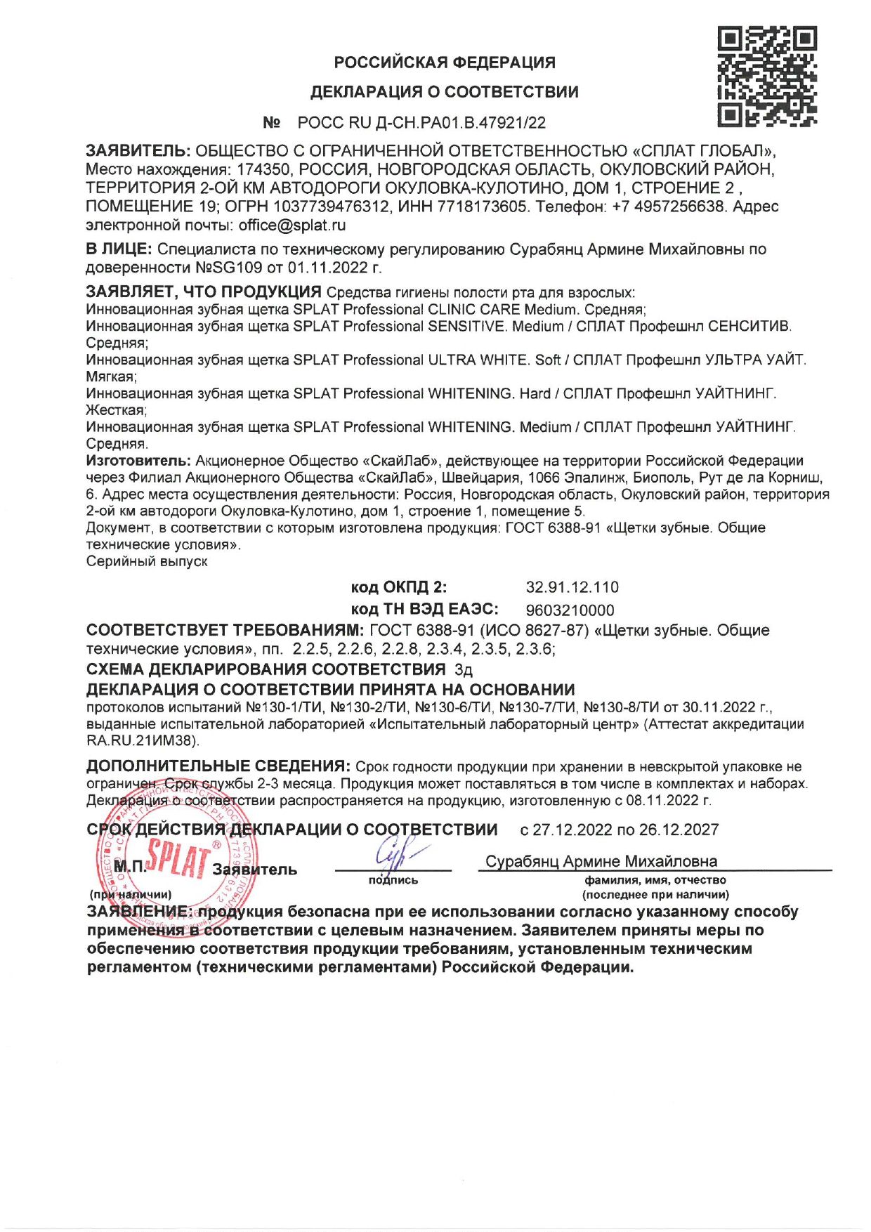 Зубная щетка жесткая SPLAT PROFESSIONAL "WHITENING", безопасное отбеливание, 111.14072.0101